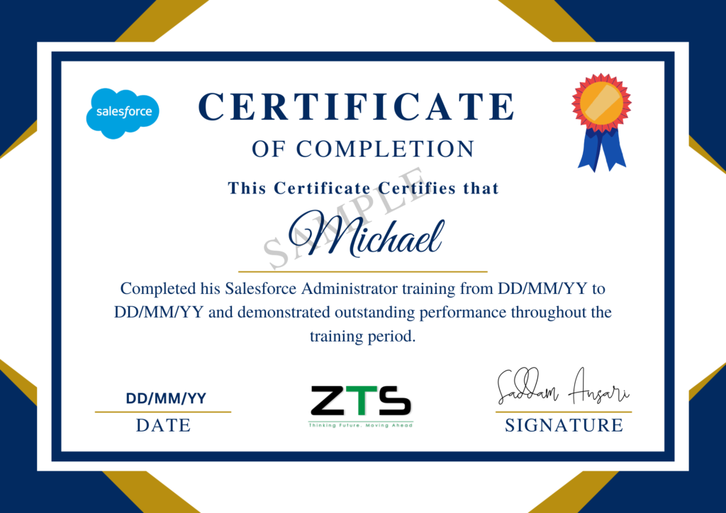 This certificate confirms that the candidate has successfully completed the Salesforce Administrator training.